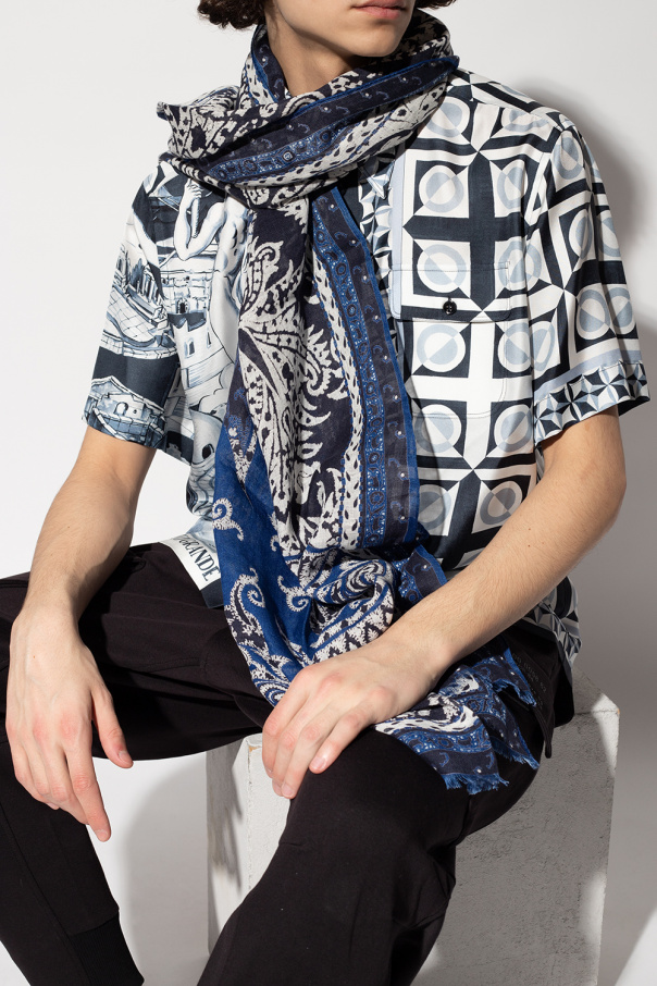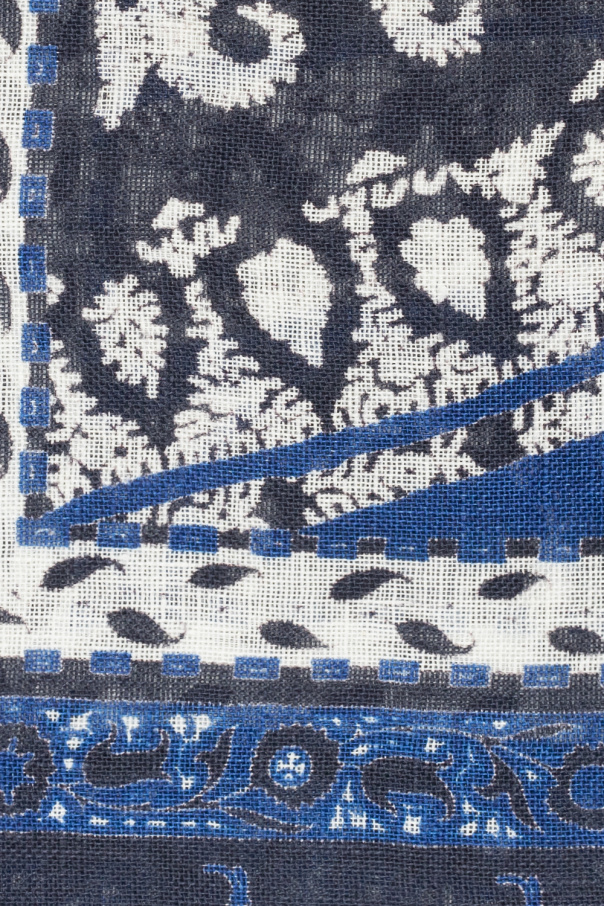 Navy, white and blue patterned scarf from Etro. Crafted from linen, this design is complete with raw cut edges.