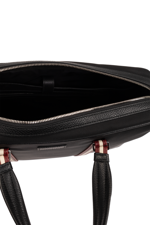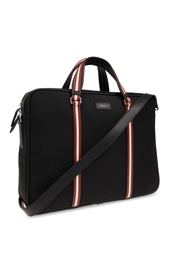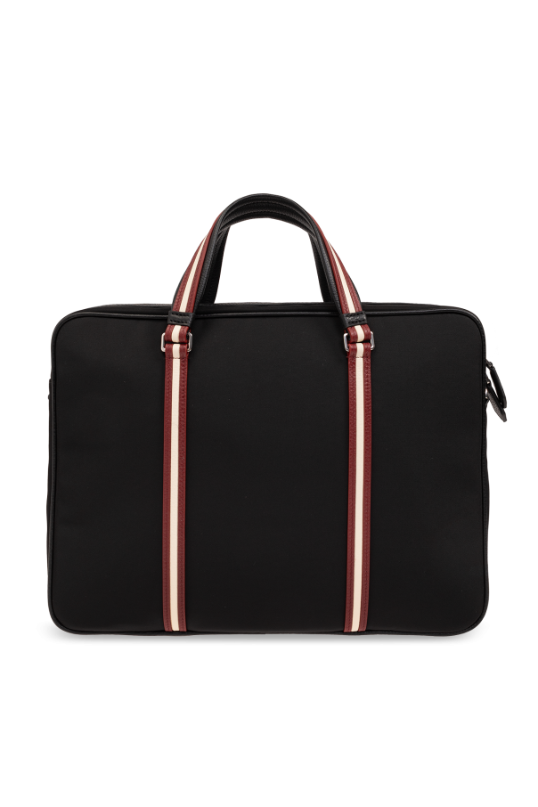 Black, maroon and cream document bag from Bally. Made of fabric with leather trims, this model features a two-way zip, patch with a silver-tone logo print, two half-round handles, detachable and adjustable strap, silver-tone metal hardware and one internal compartment with one snap-fastened laptop pocket, one zip pocket and one slip pocket.