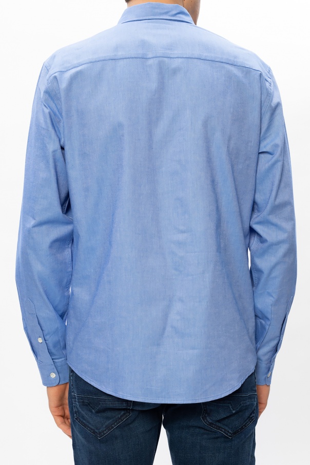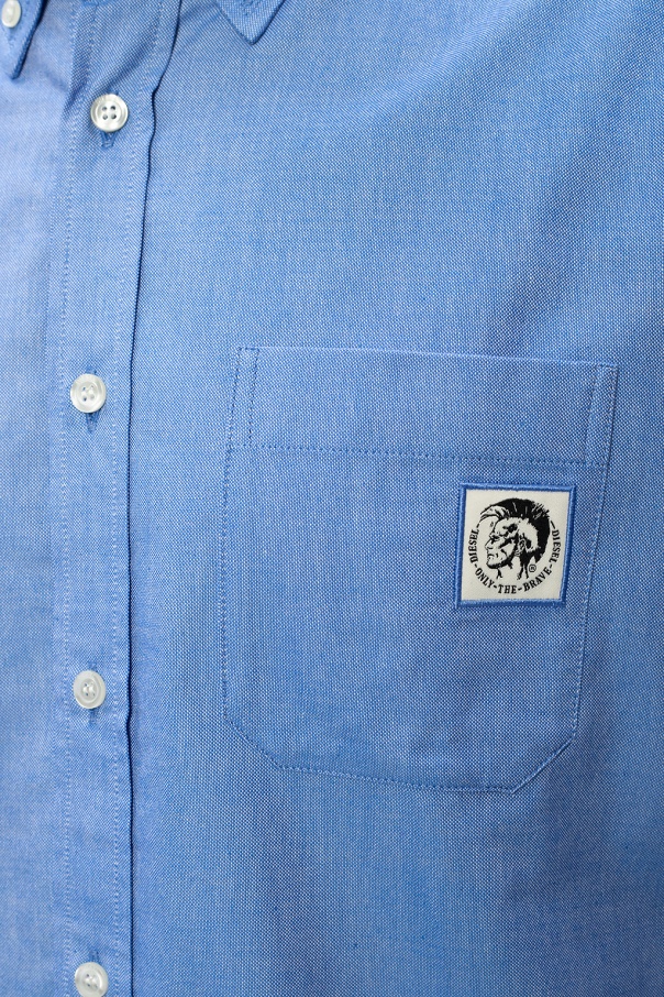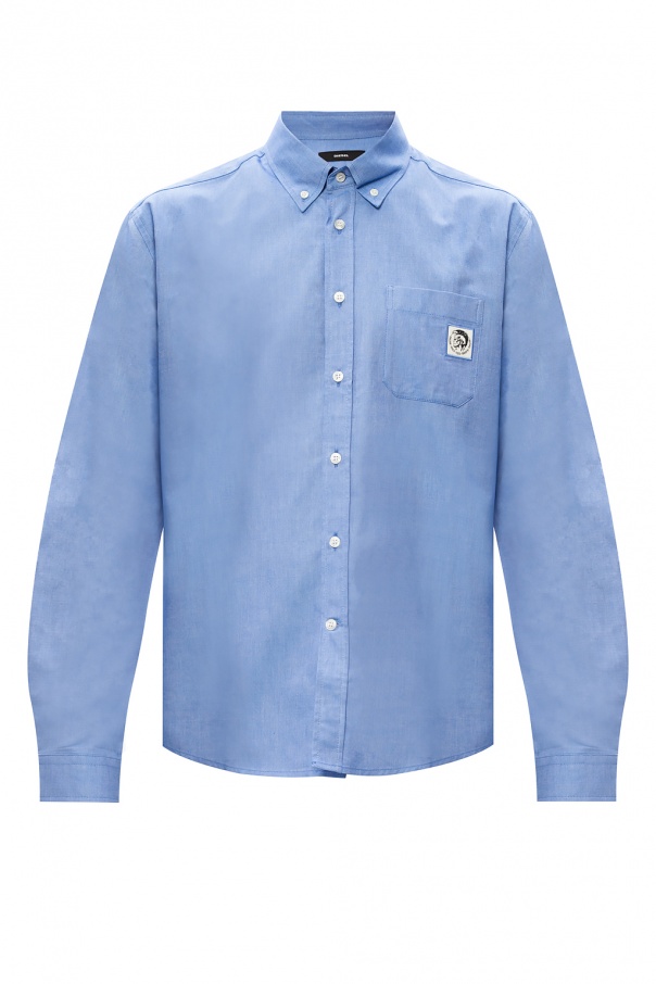 Blue shirt from Diesel. Emblazoned with a white and black branded patch, this cotton-crafted style is complete with button closure and a slip chest pocket.