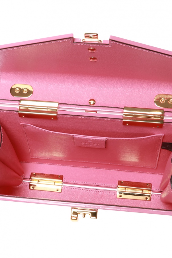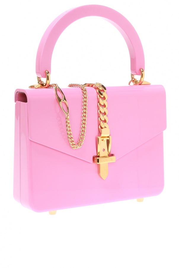 Pink ‘Sylvie 1969’ handbag from Gucci. Fastened with a logo-embossed snap. Half-round handle. Enriched by a decorative applique in gold-tone. One compartment and a slip pocket inside.