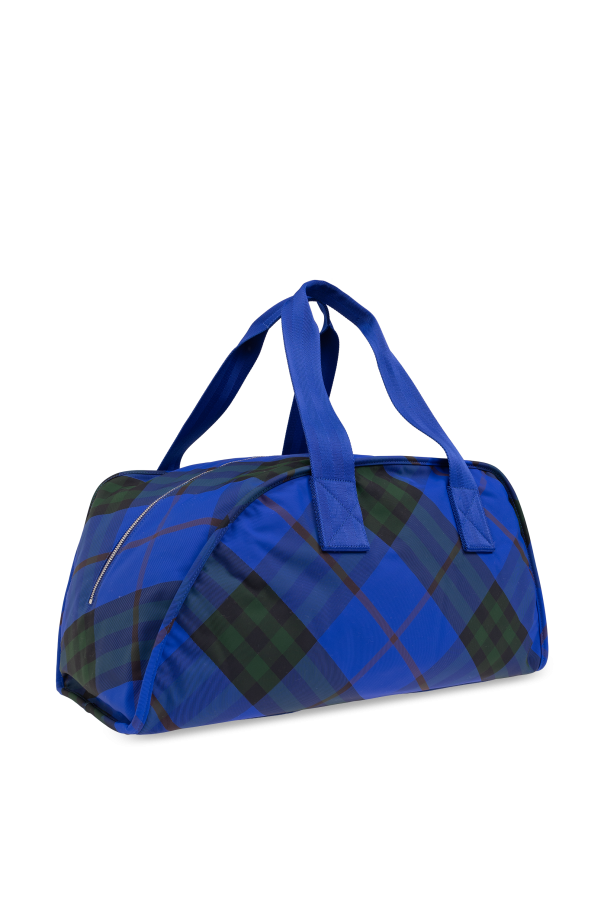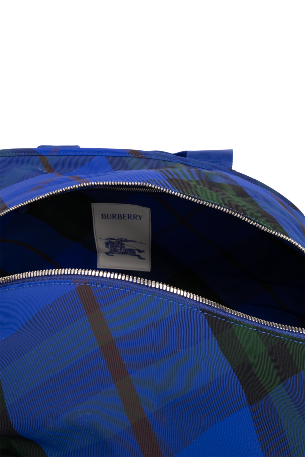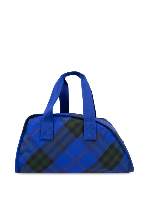 Introducing the quintessence of British heritage and craftsmanship, the Burberry Travel Tote. Adorned in the iconic Burberry Check, this handbag seamlessly marries the classic charm of tartan with contemporary functionality. The vibrant interplay of blue, green, and red hues set against a durable polyamide fabric encapsulates both style and practicality. The bag\'s robust construction is evident in its sturdy handles, dyed in a rich shade of blue to match the bag\'s primary color. Attention to detail is showcased through the meticulous stitching visible on the handles and the reinforced \"X\" stitching at the attachment points, ensuring longevity and resilience. A substantial, dual-pull zipper secures the bag\'s contents, blending security with ease of access. Inside, a spacious main compartment and an additional zipped pocket provide ample storage for your essentials, while the silver-toned metal finish adds a touch of elegance. The rectangular silhouette with subtly rounded edges gracefully narrows towards the top, enhancing its sophisticated appeal. Why Purchase This Burberry Travel Tote? Iconic Burberry Check design, embodying timeless elegance. Constructed from high-quality polyamide for durability and resilience. Detail-oriented craftsmanship, including reinforced stitching for added strength. Functional design with secure, dual-pull zipper and ample storage space. Delicate balance of classic style and modern utility.
