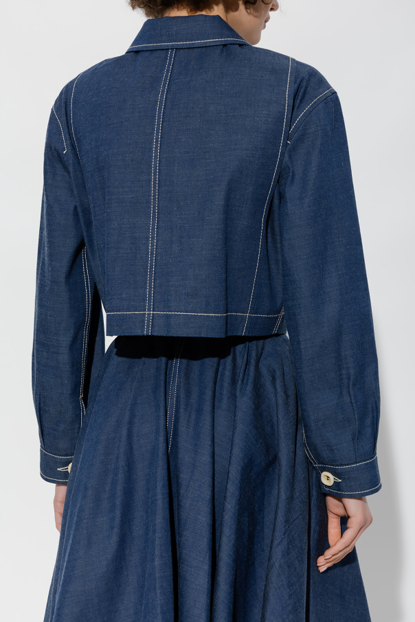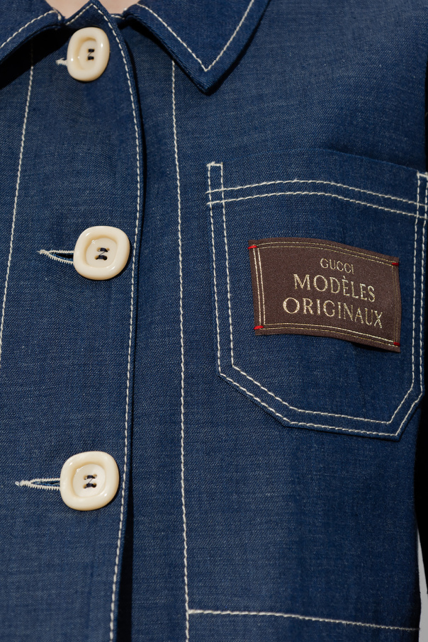 Navy blue denim jacket from Gucci. Cut with a cropped, relaxed fit, this style fastens with buttons and features a brown slip pocket accentuated with lurex logo embroidery, contrasting white stitching details and long sleeves with button cuffs.