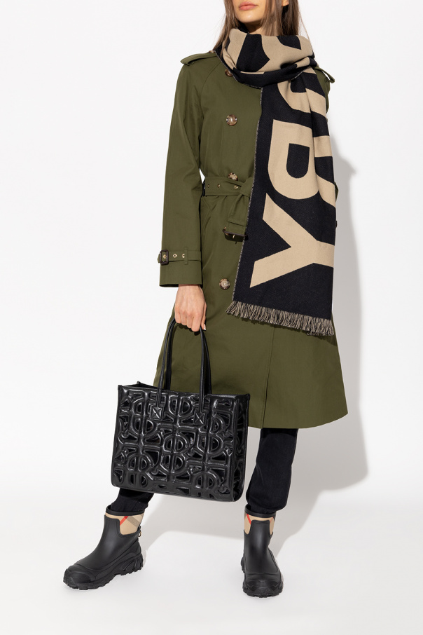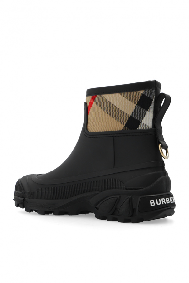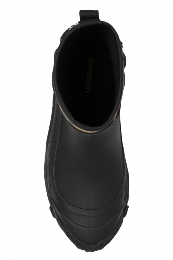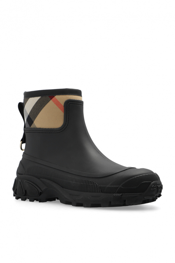 Black ‘Ryan’ rain boots from Burberry. Made with at least 30% bio-based materials, white are derived from renewable natural resources such as plants and castor oil, this model features a slip-on silhouette with a beige fabric overlay decorated with the brand's signature check pattern, a strap with a metal D-Ring application at the back and a black rubber sole accentuated with a white logo at the base.