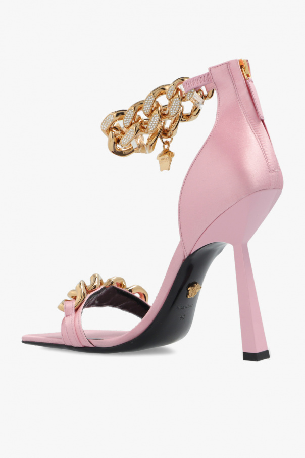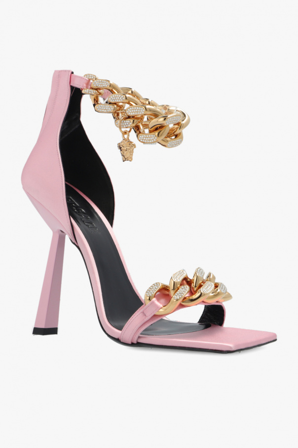 Light pink satin heeled sandals from Versace. Embellished with gold-tone chain links with glossy crystals and signature Medusa hardware, this model features a square toe, a back zipper and a black leather sole.