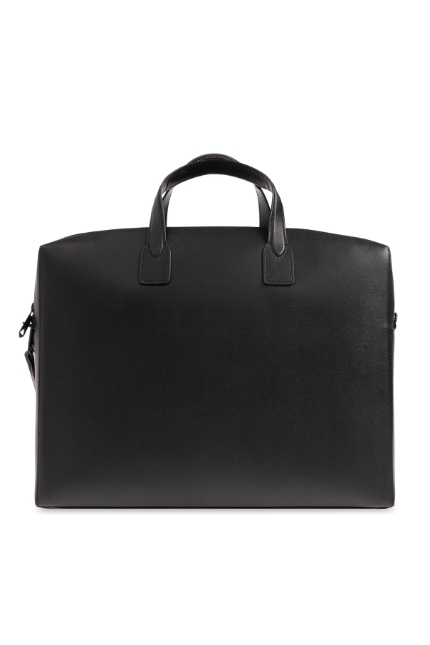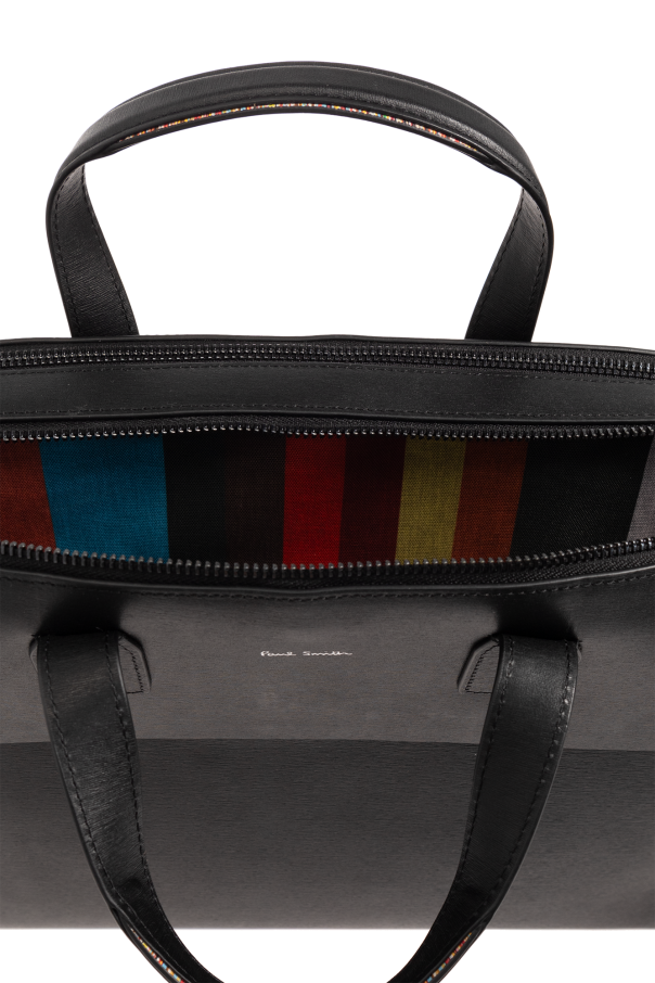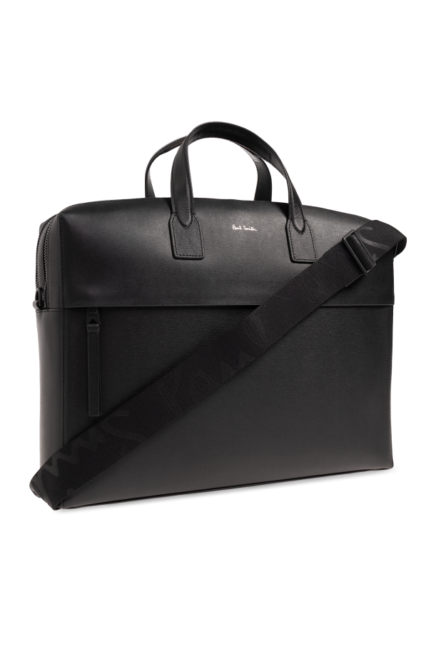 Black briefcase from Paul Smith. Made of leather, this design showcases a printed silver-tone logo, two separate compartments with two-way zips, one back zip pocket, two half-round handles as well as a detachable and adjustable strap and one zip pocket and two slip pockets inside.