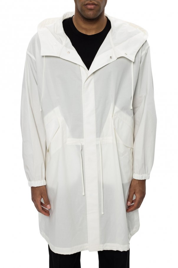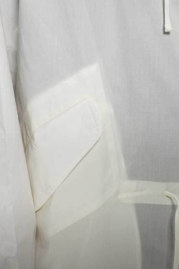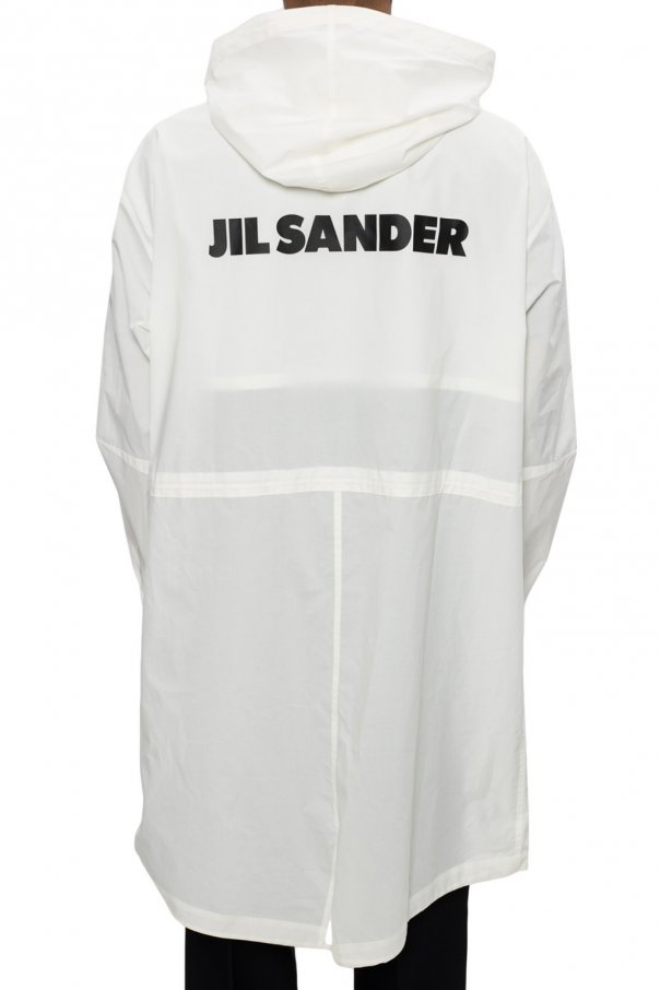 White hooded coat from Jil Sander. Made of cotton. Fastened with snaps and drawstrings. Back decorated with a black logo print. Two flap pockets on the front. Drawstring hood.