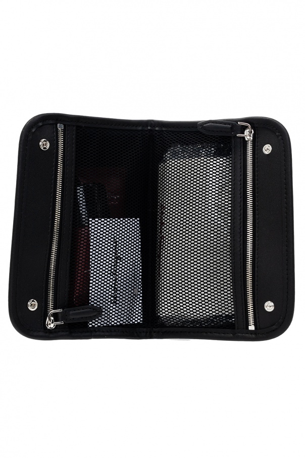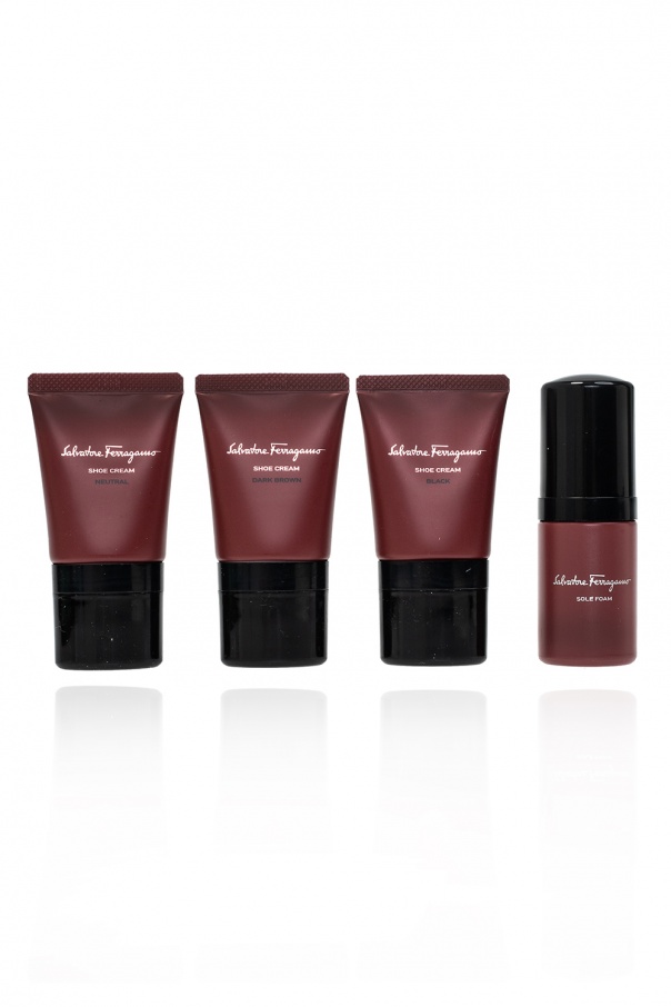 Black and grey pouch from Salvatore Ferragamo. Crafted from calf leather printed with the house's signature Gancini motif, this item fastens via snap-buttons and employs silver-tone metal fittings and two zipped mesh pockets inside. It comes with a shoe cleaning kit, which consists of: three shoe creams (neutral, black and dark brown), two brushes, cleaning wipes and a sole foam.