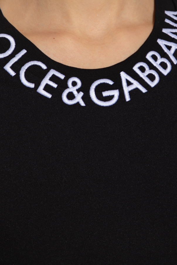 Black crewneck T-shirt from Dolce & Gabbana. Crafted from a cotton blend, this style features an elasticated collar, short sleeves and white logo embroidery on the front.