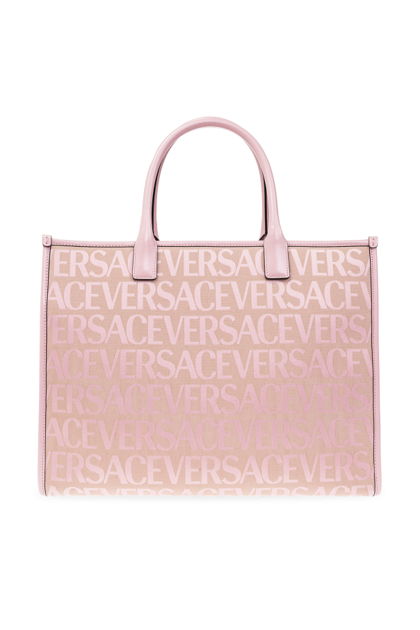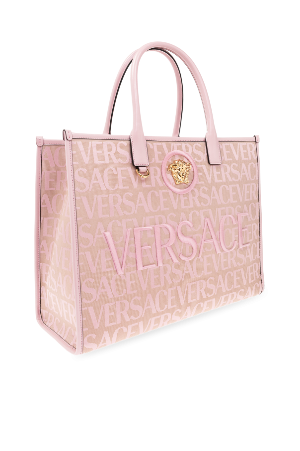 Pink and beige shopper bag from Versace. Crafted from monogrammed canvas and calf leather, this design secures with a snap and showcases a signature Medusa face plaque and logo embroidery on the front. It is complete with two half-round handles, gold-tone metal hardware and one internal compartment with two zip pockets.