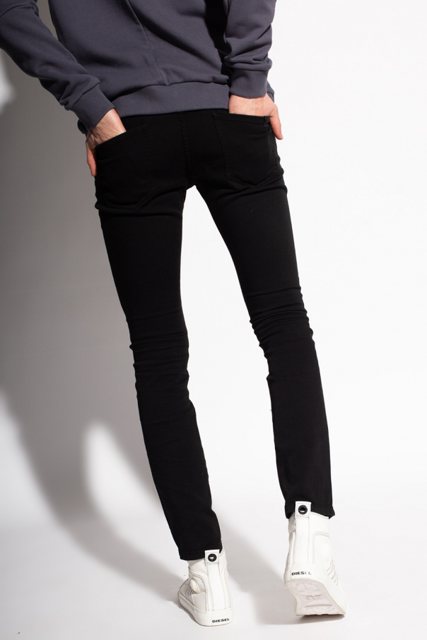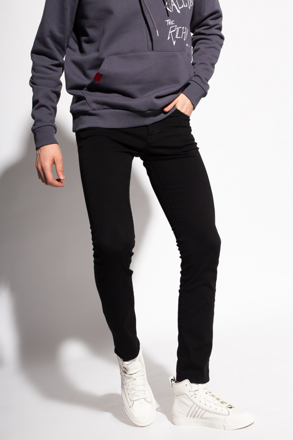 Black jeans from John Richmond. Crafted from cotton, this tapered leg design is complete with five slip pockets and a logo patch in black and white.