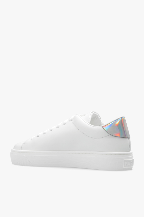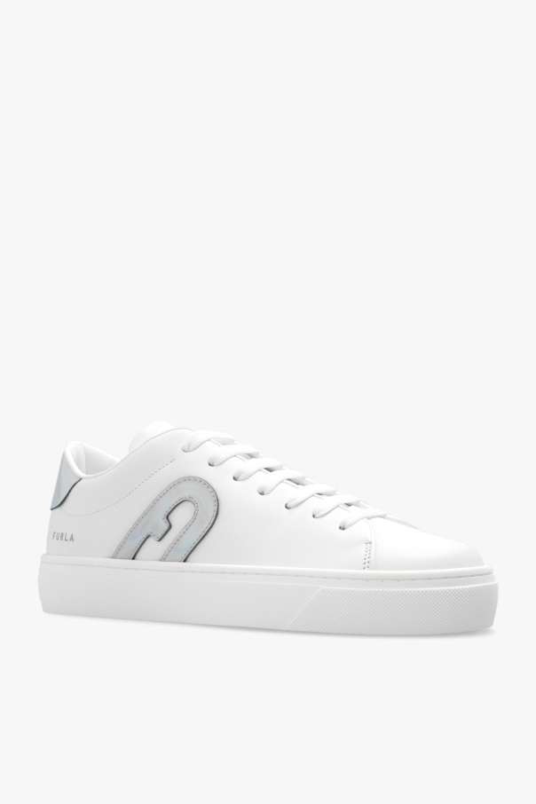 White ‘Joy’ sneakers from Furla. Made of leather, this lace-up model sits on a white rubber sole and showcases the brand\'s logo as well as a holographical logo patch and heel counter.