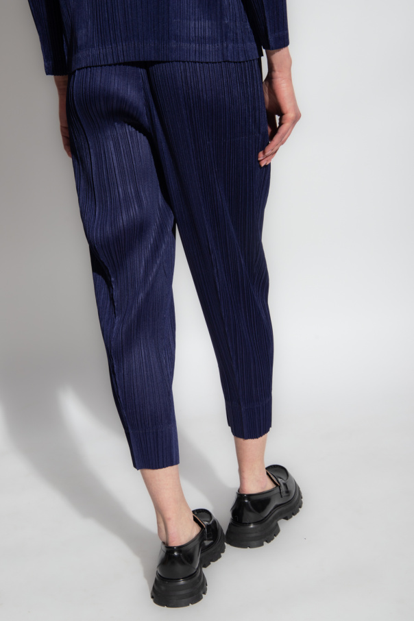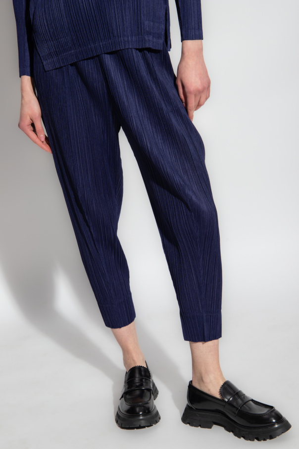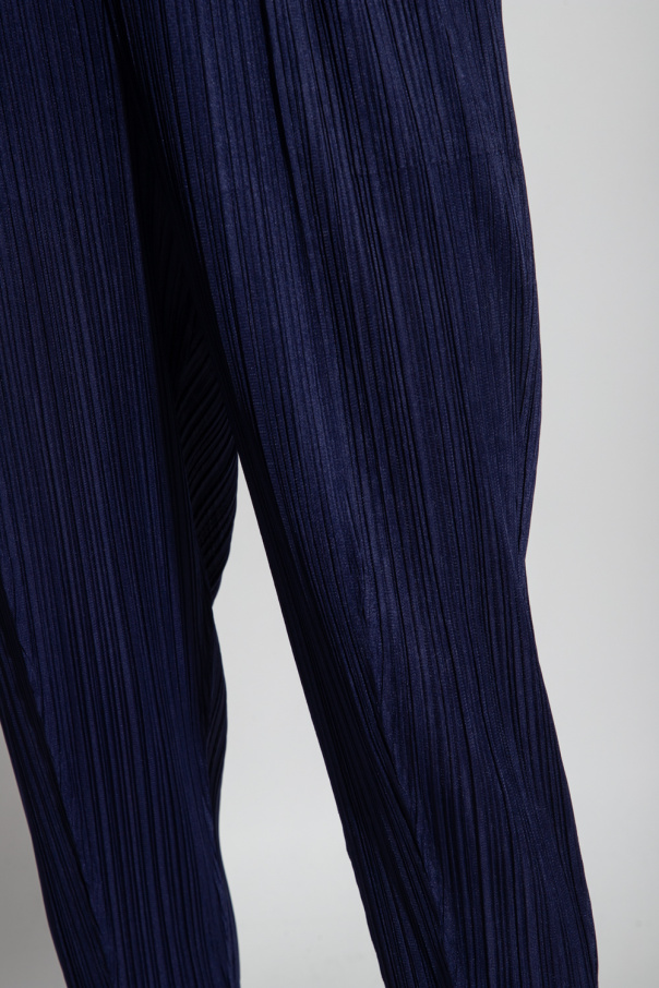 Navy blue trousers with pleats from Issey Miyake Homme Plisse. Crafted with a dropped crotch, this pair falls with relaxed-fitting, cropped legs and features an elasticated waistband.