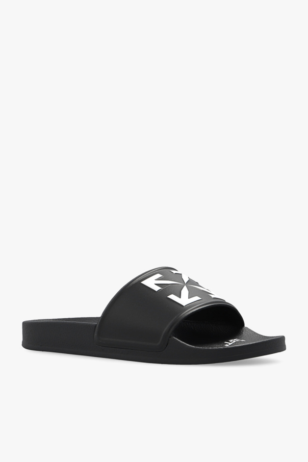 Black slides from Off-White. Resting on a black rubber sole, this pair features the brand's signature arrow motif in white.
