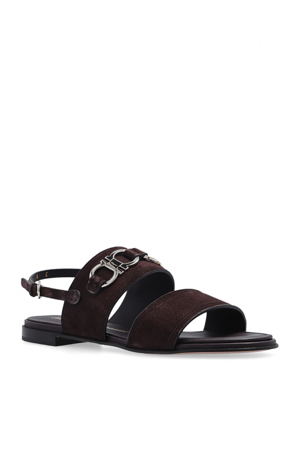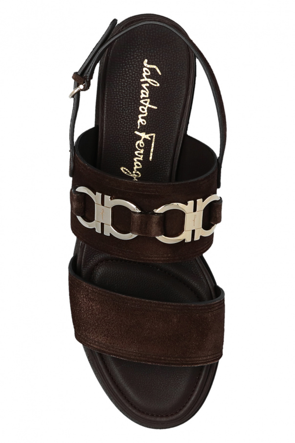 Brown sandals from Salvatore Ferragamo. Crafted from calf suede, this model features the brand's signature gold-tone Gancini buckle with an embossed logo on the front, a buckle strap fastening and a beige and brown sole in leather and rubber.