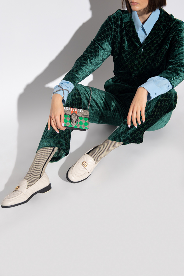 Cream quilted moccasins from Gucci. Crafted from leather, this pair features a gold-tone logo appliqué and black rubber sole.