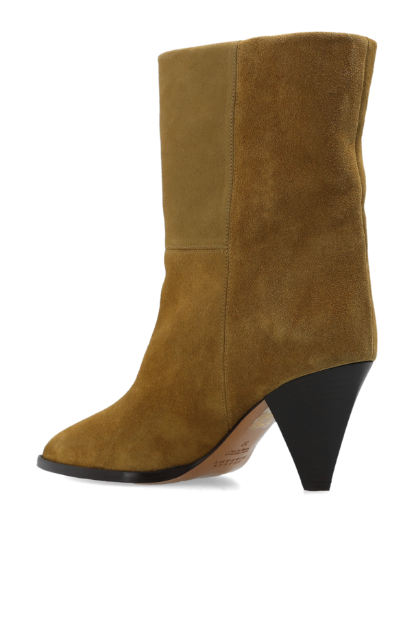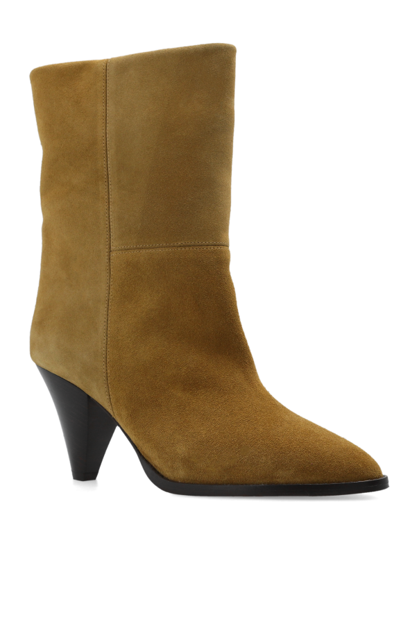 Beige ‘Rouxa’ heeled ankle boots from Isabel Marant. Made of suede, this pair sits on a brown leather sole and features a pointed toe and angled heel.