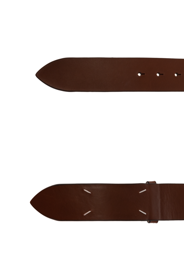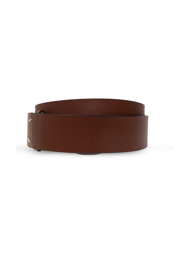 Brown belt from Maison Margiela. Made of leather, this design features white stitches and adjustable hook fastening.