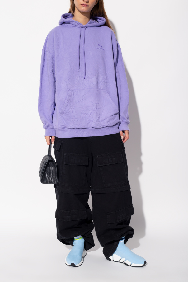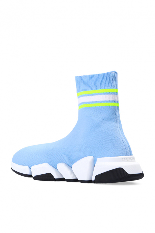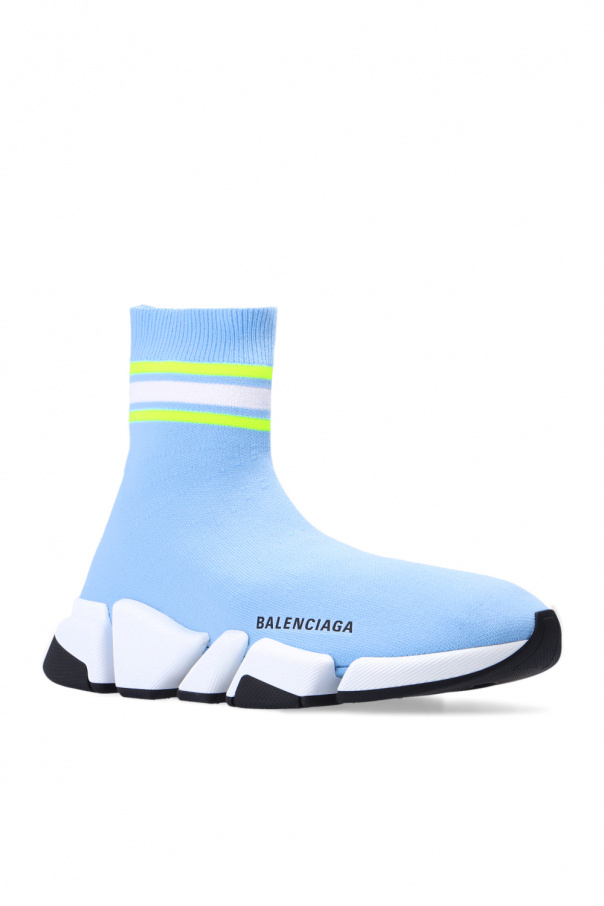 Light blue ‘Speed 2.0 LT’ high-top sneakers from Balenciaga. Made of recycled materials, this pair features a white logo print, neon yellow and white stripes on one shoe, white and navy stripes on the other, as well as rubber sole with ‘No Memory’ technology in black and white.