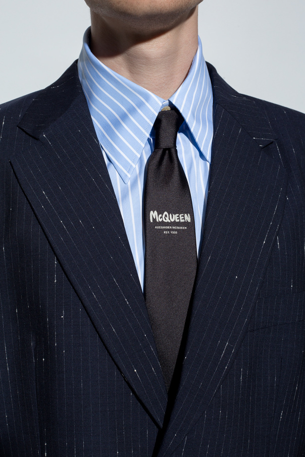 Black tie from Alexander McQueen. Made of silk, this garment is decorated with a silver-tone logo print.