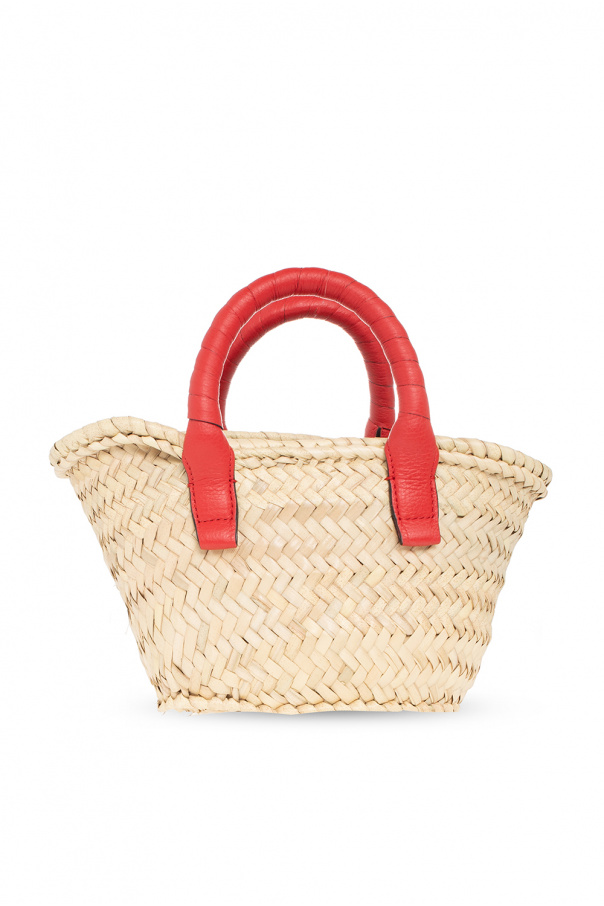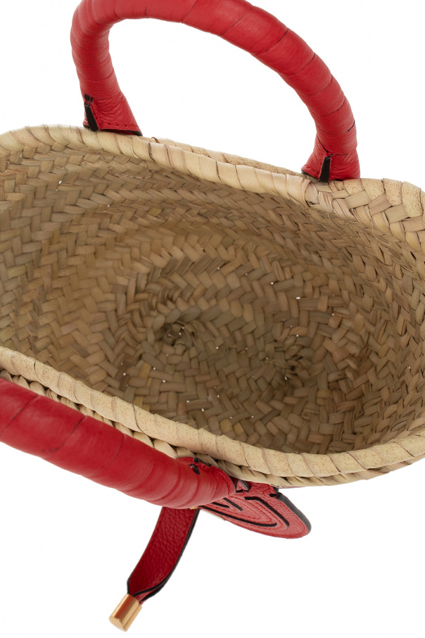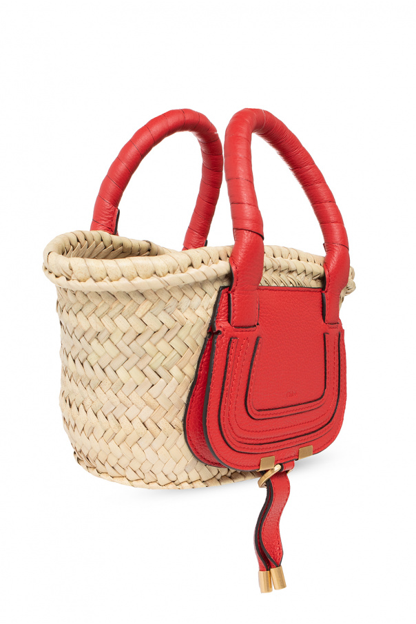Cream and red ‘Marcie Mini’ handbag from Chloé. Woven from raffia and trimmed with calf leather, this design features a pocket with a distinctive fastener, exposed stitching details and an embossed logo on the front, two half-round handles, gold-tone metal hardware and one internal compartment.