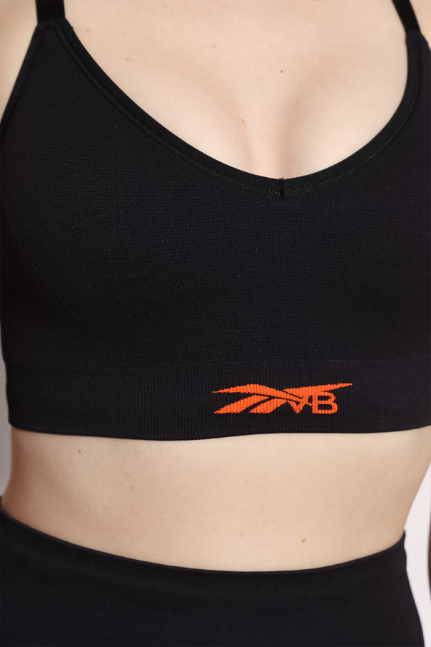 Black training crop top with straps from Reebok x Victoria Beckham. This garment features an orange logo embroidery, adjustable criss-cross straps and padded cups.