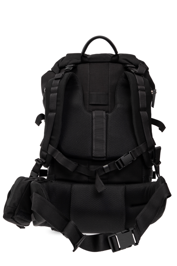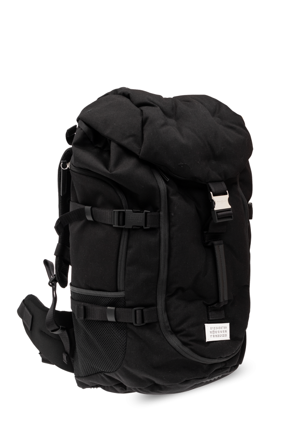 Black ‘Glam Slam’ backpack from Maison Margiela. Fastened with a snap and drawstrings, this design features a white logo patch, detachable and adjustable ergonomic shoulder straps, zipped pouch, silver-tone metal hardware and one internal compartment with one zip pocket.