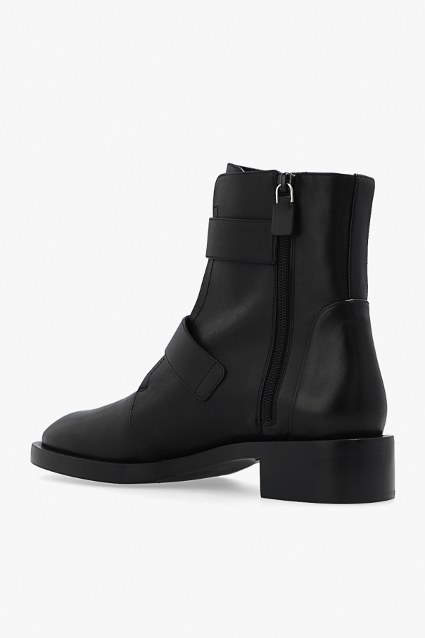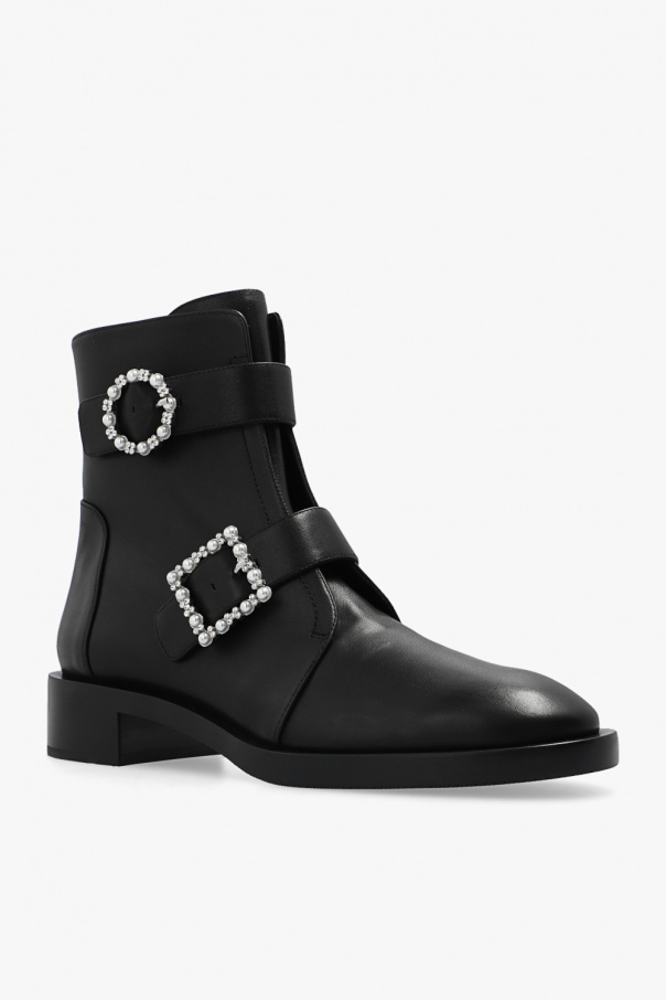 Black ‘Ryder’ ankle boots from Stuart Weitzman. Made from leather, this model sits on a black rubber sole and features a side zip fastening and two straps with distinctive buckles bejewelled with fake pearls and glossy crystals.