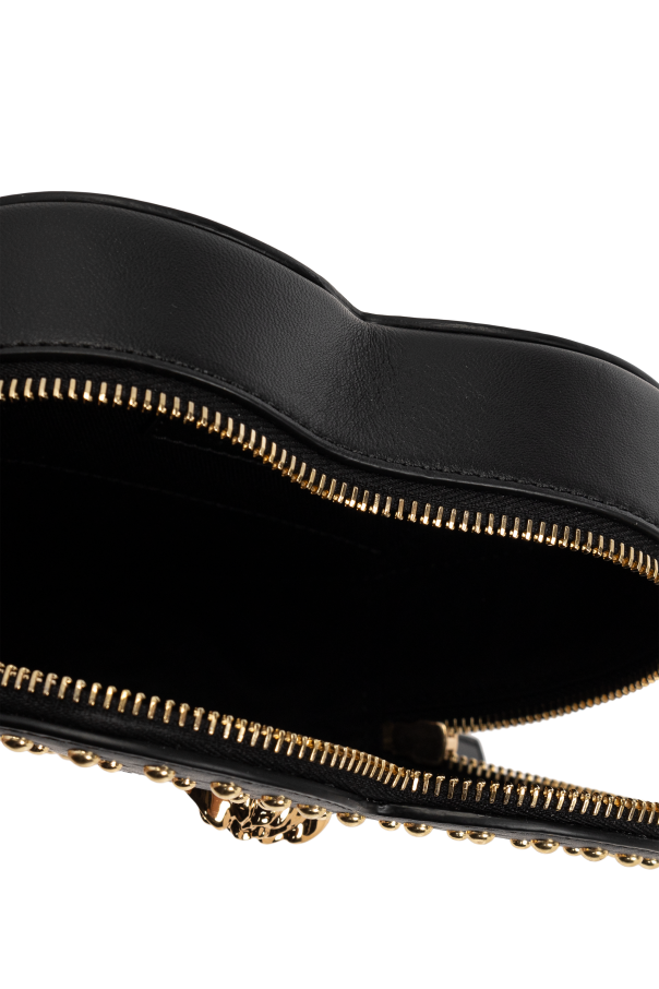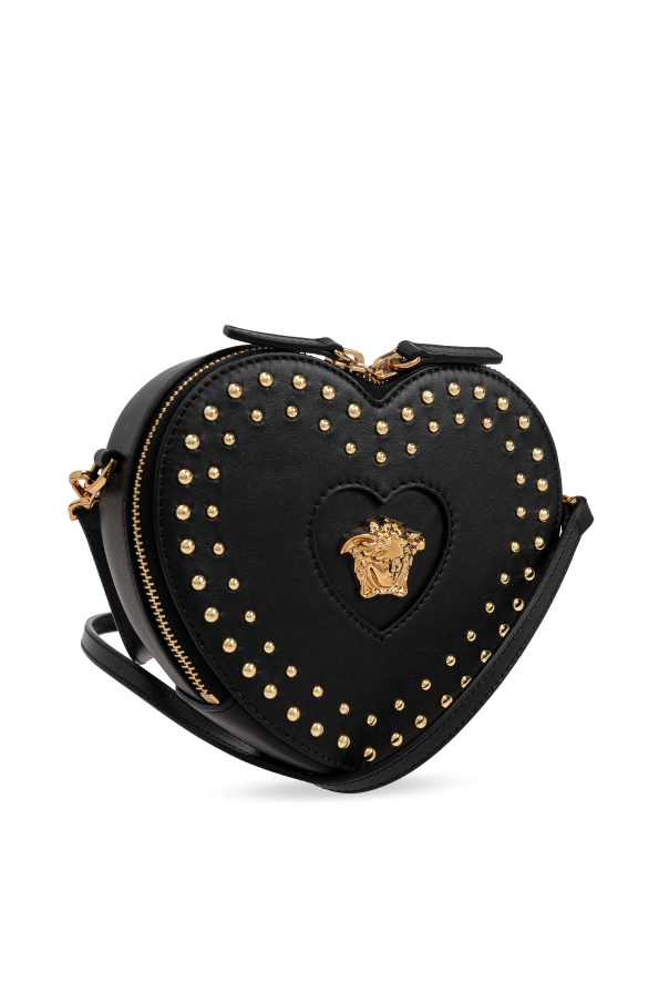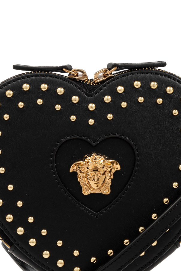 Introducing the Versace Kids \'Heart\' shoulder bag - a quintessence of elegance and daring design. Crafted with the utmost precision from 100% premium leather, this exquisite accessory captivates with its unique heart shape and sophisticated black hue. The bag\'s front is adorned with an array of golden studs and a central lion head detail, meticulously placed within a cut-out heart, serving as the emblem of unparalleled craftsmanship and designer recognition. The rear of the \'Heart\' bag presents a sleek, unadorned finish, while its sides reveal subtle curves that enhance its flat silhouette. A golden zipper complements the bag\'s luxurious accents, reinforcing its cohesive and stylish appearance. The adjustable strap ensures a customizable fit, making this small yet striking piece a versatile addition to any fashion ensemble. Why Purchase This Product? Elegantly designed with a unique heart shape and signature lion head detail. Exclusively crafted from high-quality leather for durability and a luxurious feel. Adorned with golden studs and accents that enhance its sophisticated allure. Features an adjustable strap for personalized comfort and styling versatility. Encapsulates the exquisite craftsmanship and iconic design ethos of Versace Kids.