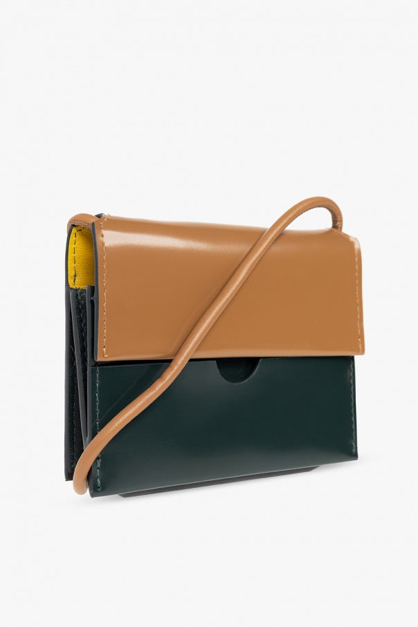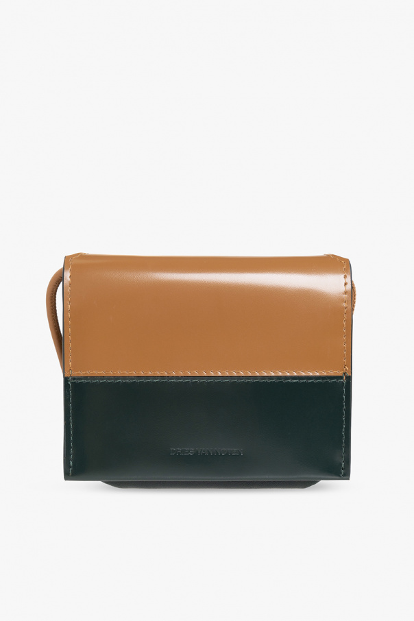 Dark green and beige strapped wallet from Dries Van Noten. Crafted from patent leather, this design secures with a snap and features an embossed logo at the back and a beige-clad interior with one compartment, one zip coin pocket and two card slots.