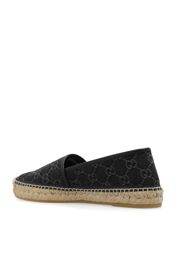Black and grey espadrilles from Gucci. Made from cotton and trimmed with leather, this model sits on a beige rubber sole and showcases a monogram pattern.