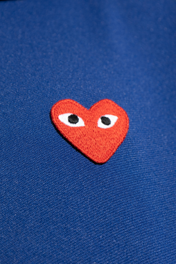 Navy sweatshirt from Comme des Garcons Play. This long sleeve design features a drawstring hood, two slip pockets, logo patch in red, white and black as well as ribbed trims at the hem and cuffs.