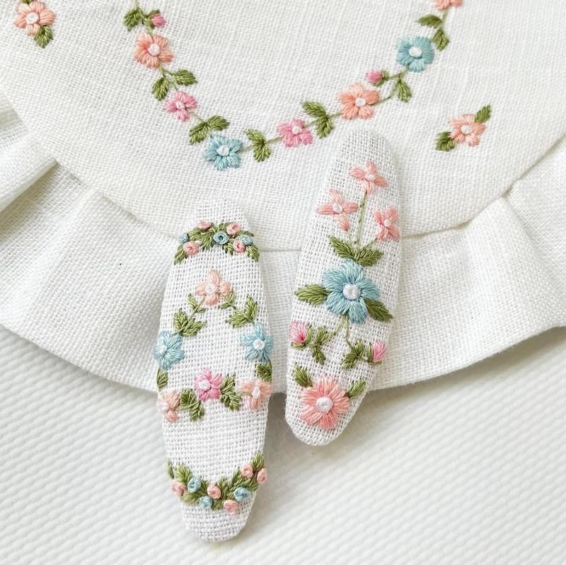 Особенности: аксессуары для волос с вышивкой ручной работы – детская заколка клик-клак для волос своими руками с авторской вышивкой розово-голубые цветочки. Основа заколочек выполнена из ткани - натуральный лен. Ручная вышивка цветы выполнена из использования шелковых нитей DMC Франция. Женские заколочки имеют металлическое основание клик-клак длиной 6 см