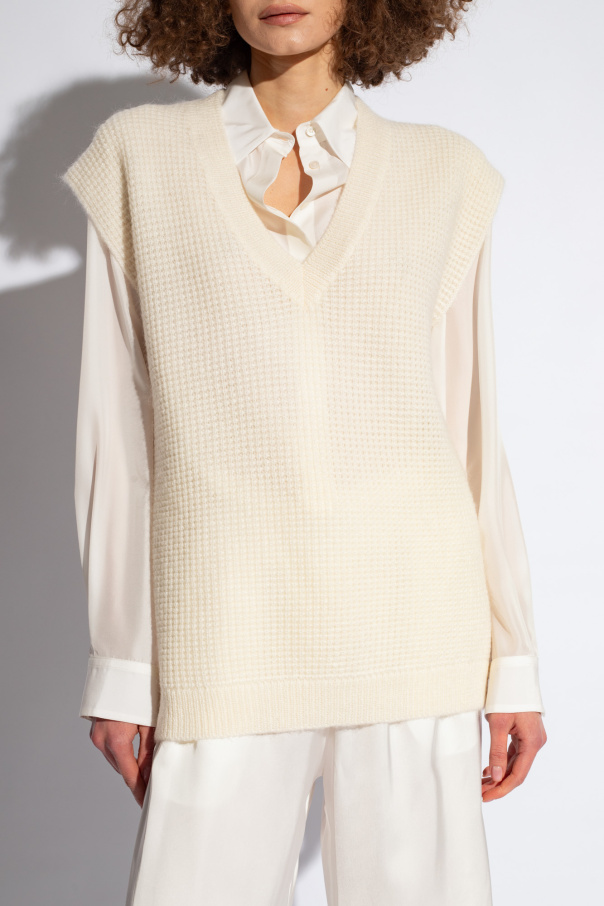 Cream vest from Fabiana Filippi. Made from a mohair and wool blend, this style features ribbed trims on the V-neckline, bottom hem and shoulder edges.