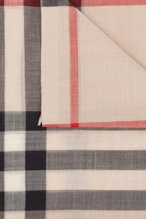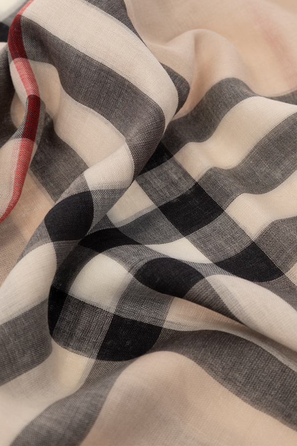 Cream scarf from Burberry. Crafted from a wool and silk blend, this design is enriched by the brand’s signature multicolored check and raw cut edges.