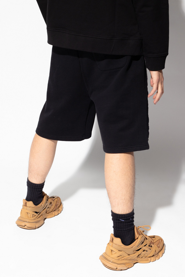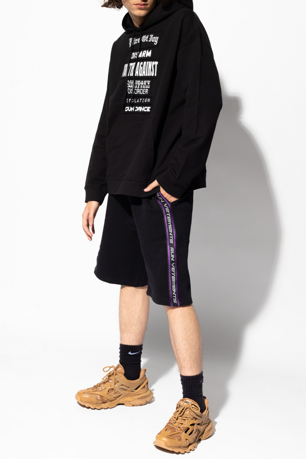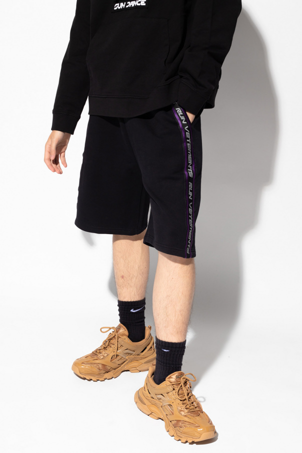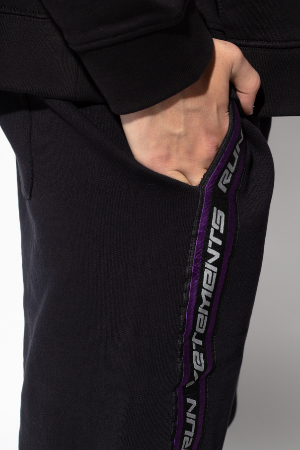 Black shorts from VETEMENTS. Made of cotton, this design features a drawstring waist, black and purple side stripes embroidered with grey logo details, two front pockets and one back pocket with a logo embroidery.
