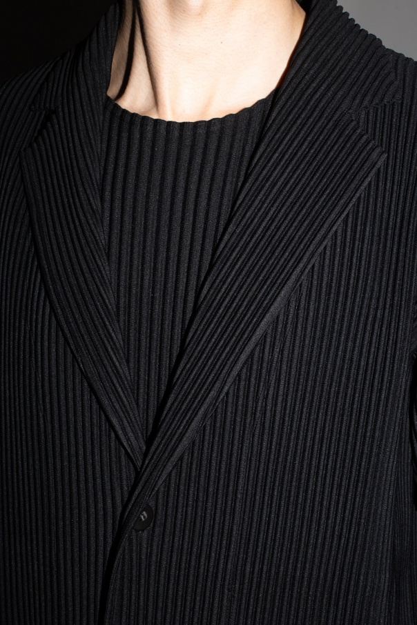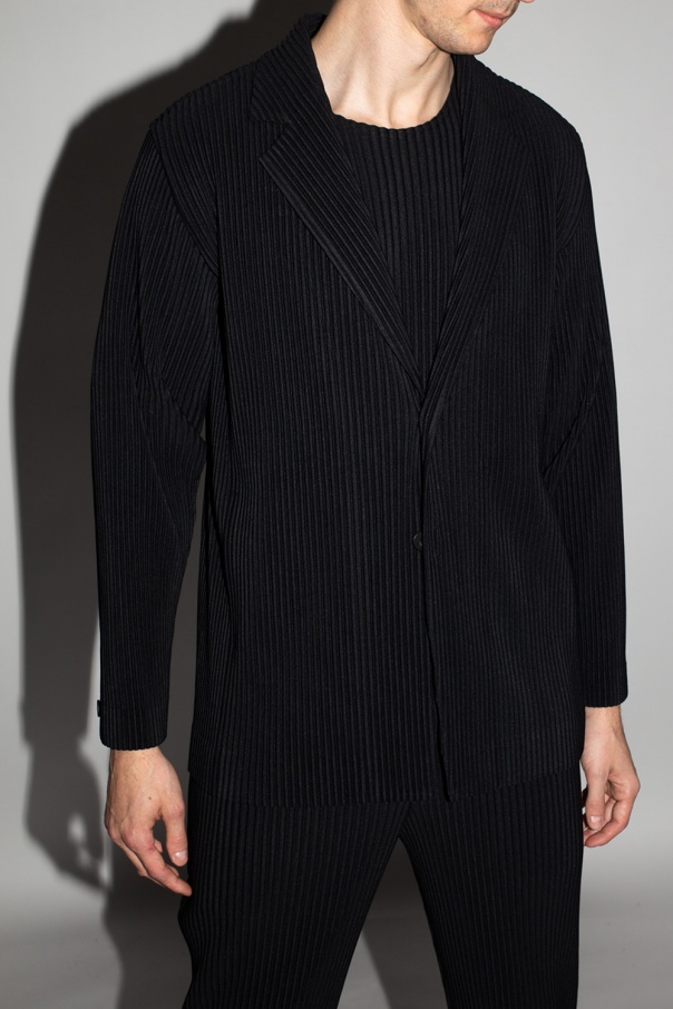 Black blazer from Issey Miyake Homme Plissé. Embellished with the label\'s signature pleating technique, this style features button fastenings, notched lapels and two frontal pockets.
