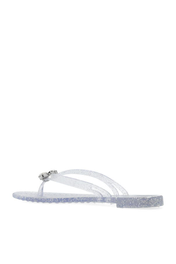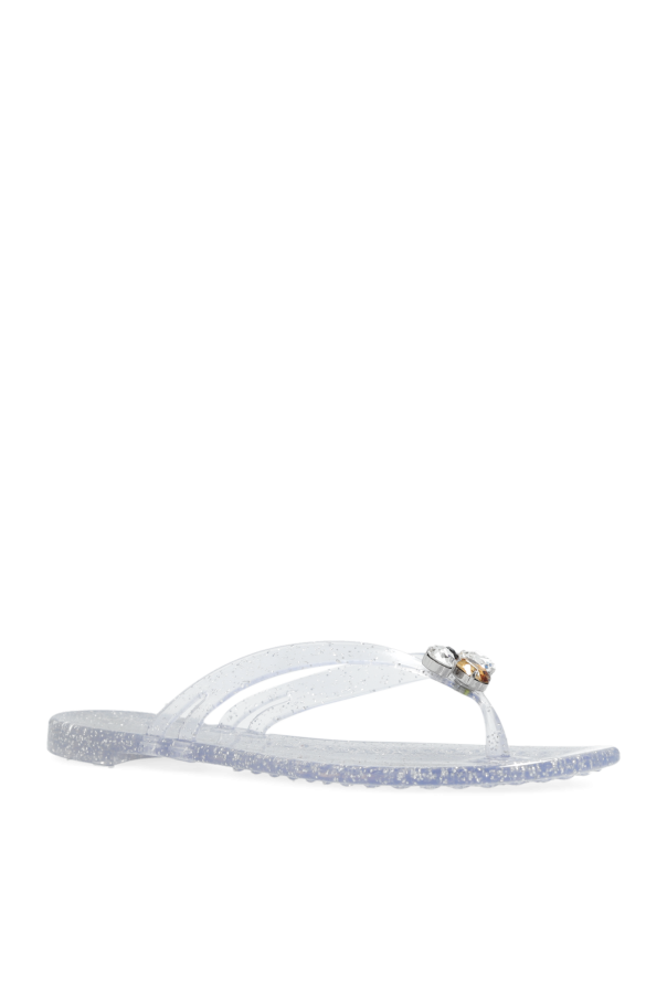 Transparent ‘Jelly’ flip-flops from Casadei. Made from glittery rubber, this model sits on a transparent rubber sole and showcases a bee appliqué spruced up with sparkling crystals on the front.