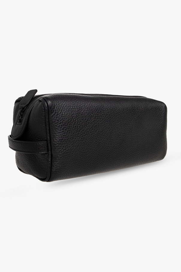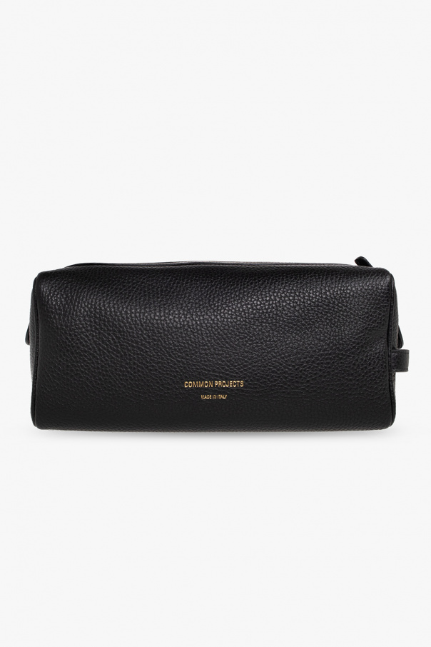 Black wash bag from Common Projects. Made of leather, this item is complete with a zip fastening, gold-tone logo print, half-round handle on the side, black metal hardware and one internal compartment with one zip pocket.