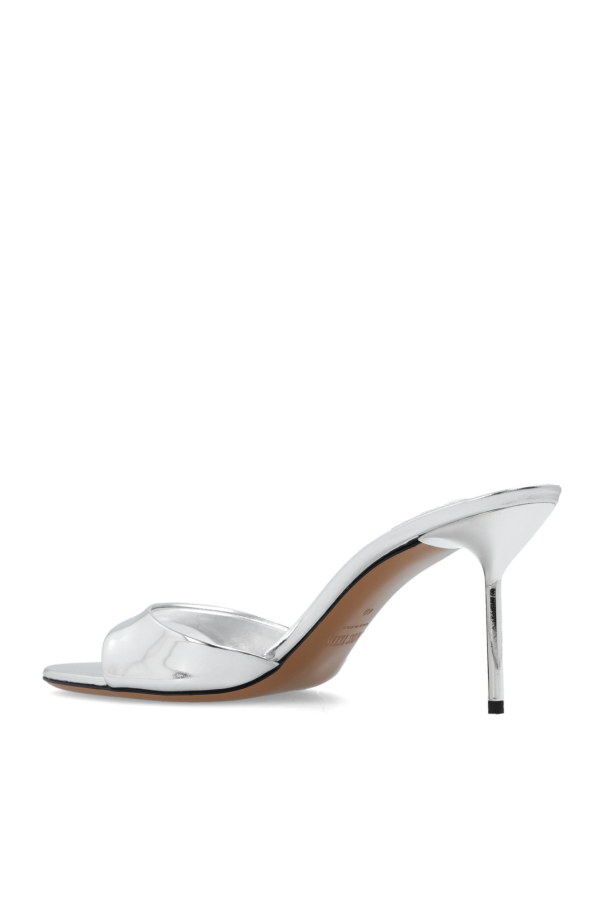 Silver-tone ‘Lidia’ stiletto mules with a brown leather sole from Paris Texas. Made of patent leather.