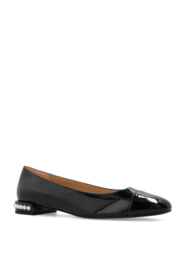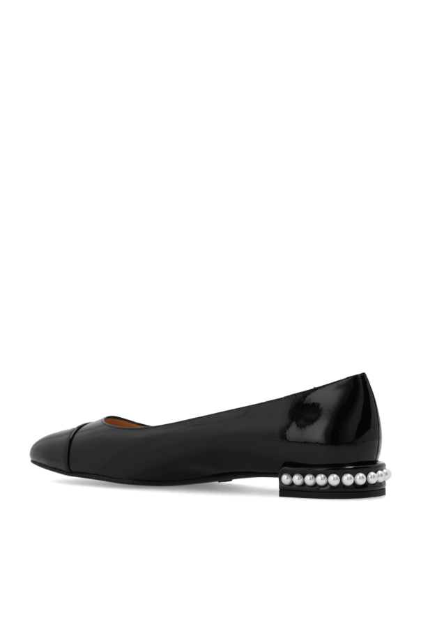 Black ‘Pearl’ ballet flats from Stuart Weitzman. Made of glossy leather with a round toe, this model sits on a black rubber sole and showcases white pearl appliqués.