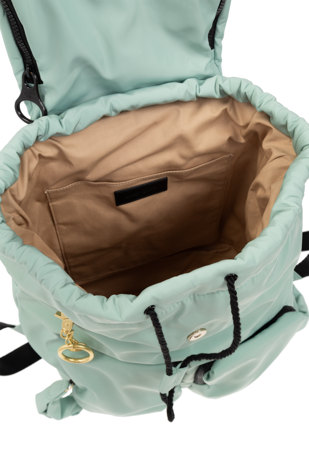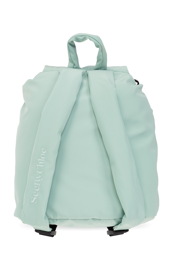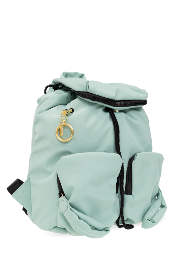 Blue and green ‘Joy Rider’ backpack from See By Chloe. Crafted from recycled material Repreve®, this design cinches closed with drawstrings and features a detachable star patch with logo embroidery, adjustable shoulder straps, one top handle, gold-tone metal hardware, three external zip pockets as well as a snap-fastened flap and one internal compartment with three slip pockets.