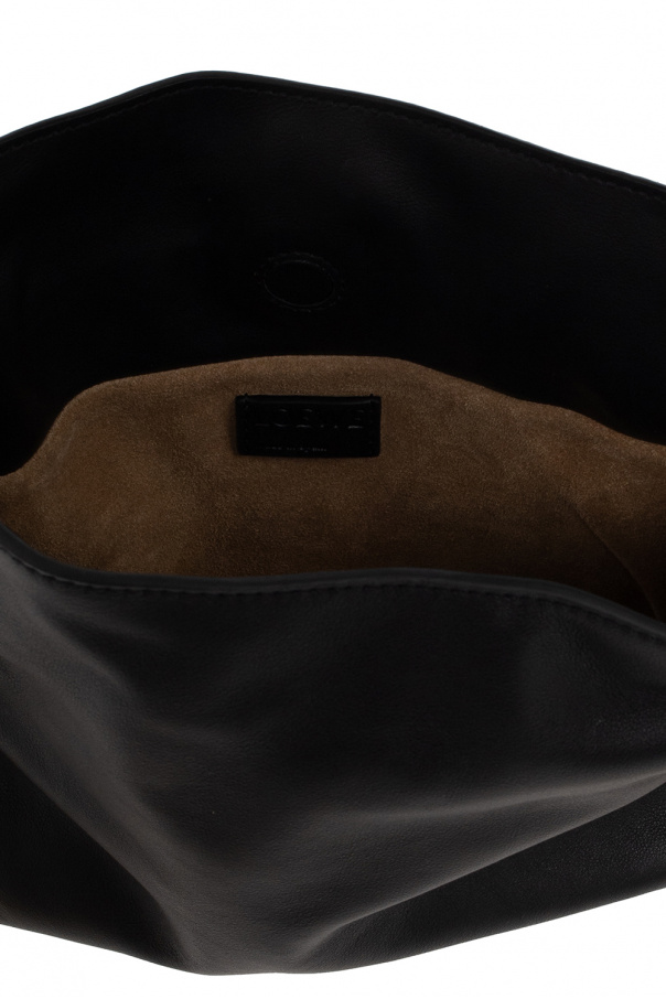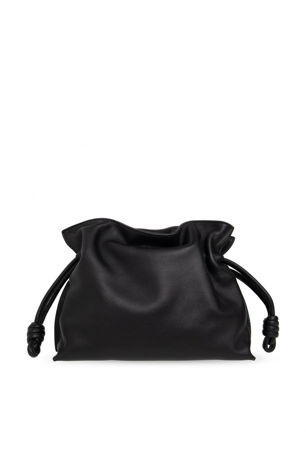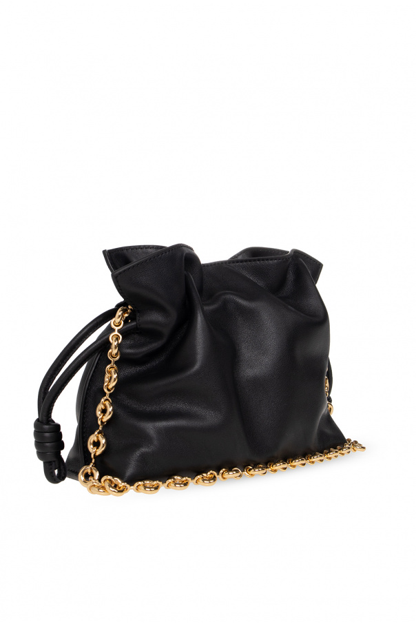 Black ‘Flamenco Mini’ handbag from Loewe. Crafted from calf leather, this design secures with a magnetic snap and features decorative drawstrings on the sides, an embossed logo on the front, a detachable gold-tone chain and one internal compartment.