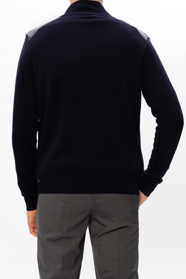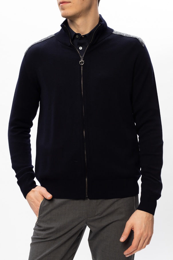 Navy blue sweatshirt from Salvatore Ferragamo. Boosted with a jacquard branding, this wool-crafted style fastens via a zip and features two frontal pockets and a ribbed bottom hem and cuffs.