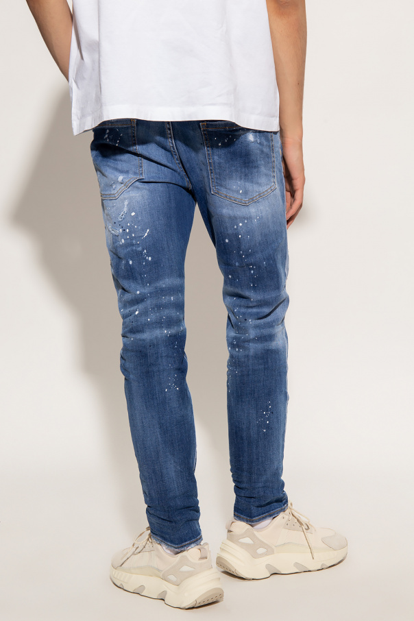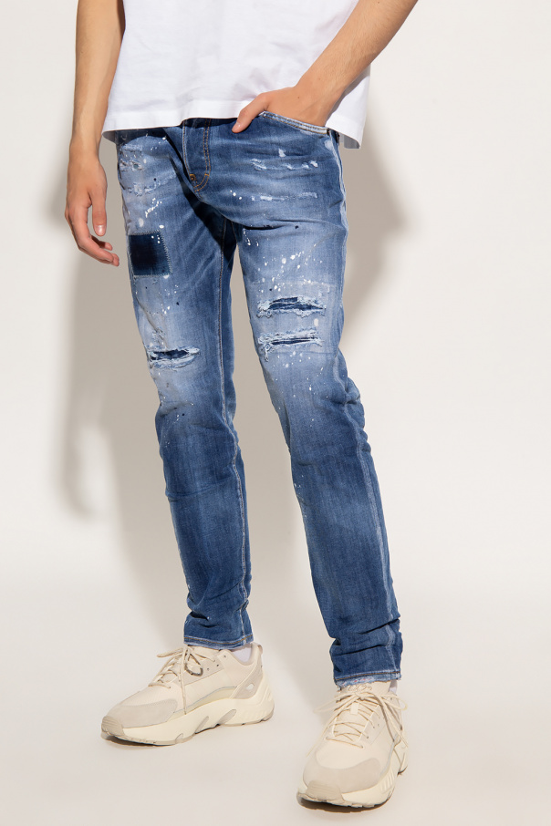 Blue and white ‘Cool Guy Cropped’ jeans from Dsquared2. Made of cotton, this pair falls with tapered legs and features button fastenings, classic five pockets, paint splatters, a distressed treatment and a beige patch with an embossed logo at the back.