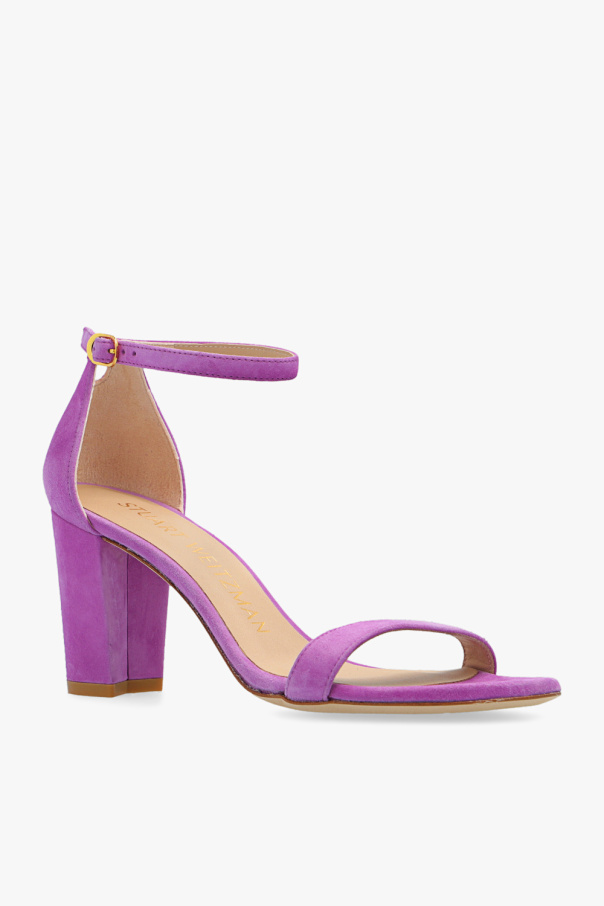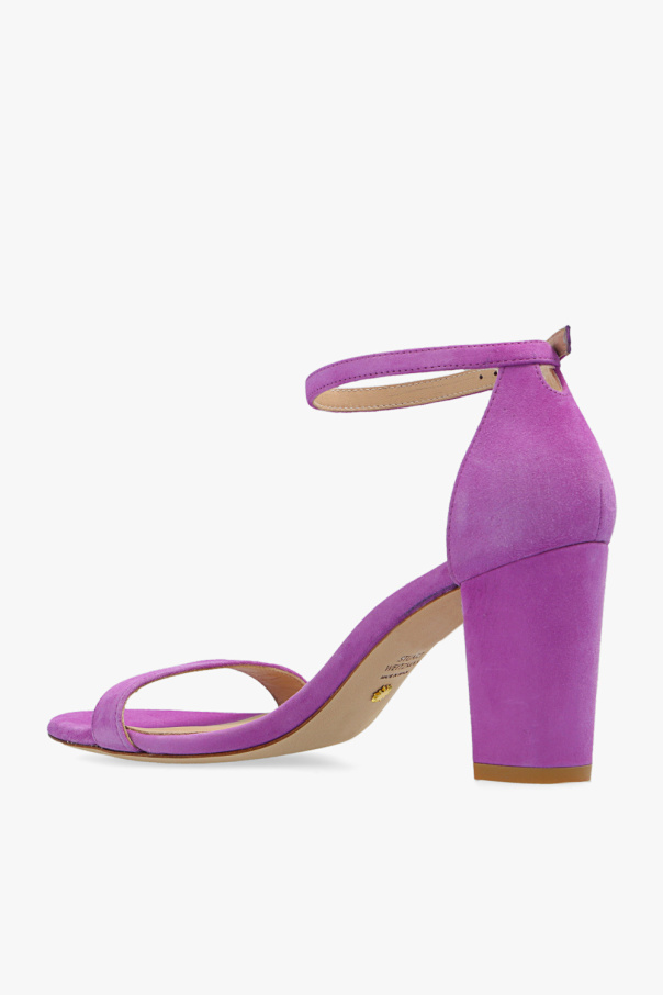 Pink ‘Nearlynude’ heeled sandals from Stuart Weitzman. Made of suede, this pair features an adjustable buckled ankle strap, rounded toe and cream leather sole.