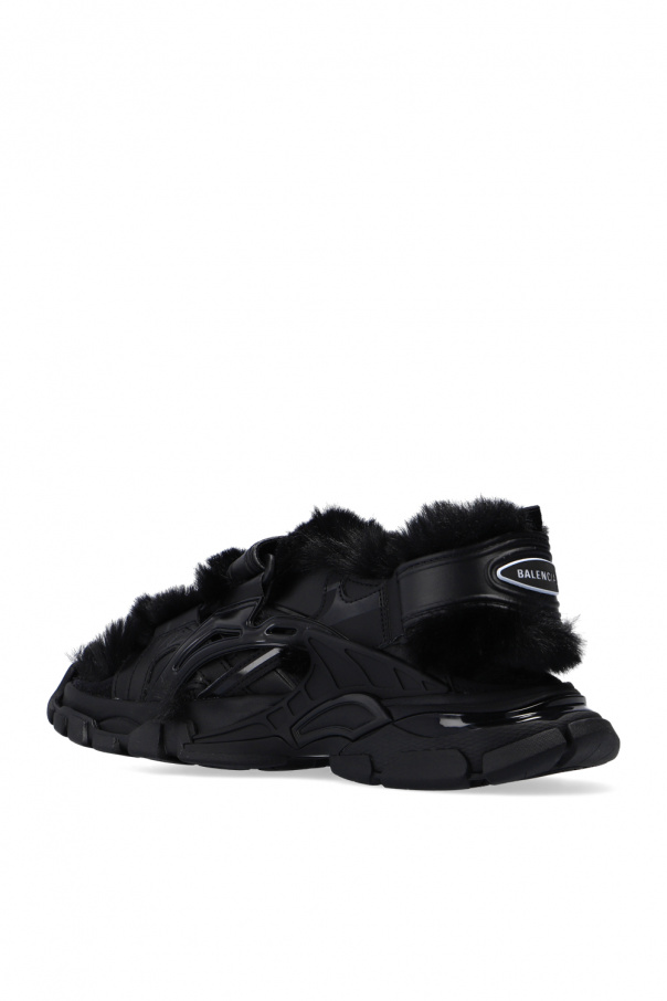 Black ‘Track’ sandals from Balenciaga. Enriched by the brand\'s logo, this model features a velcro fastener, a fake-fur lined footbed, rubber trims and a black rubber sole.