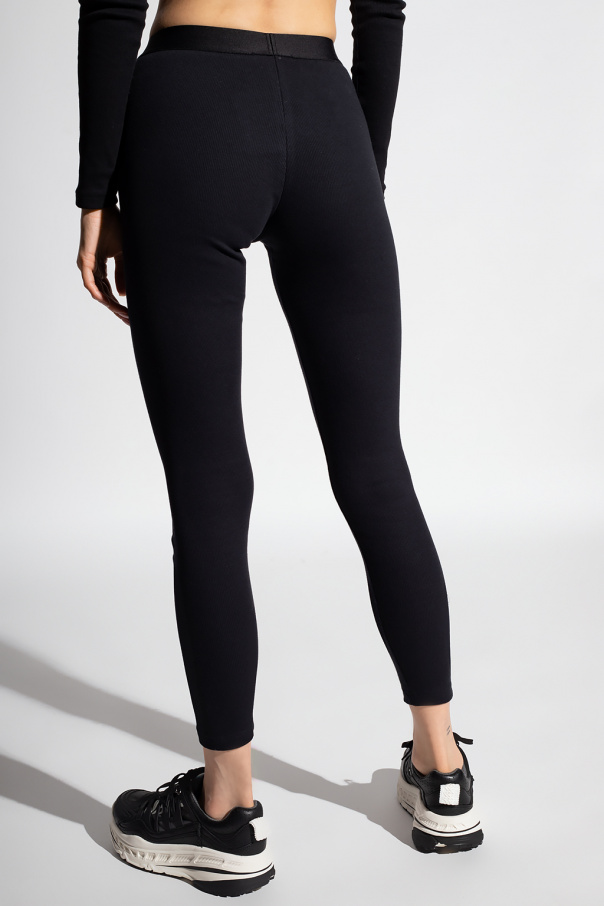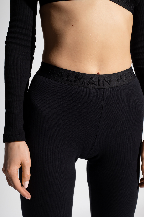 Black ribbed leggings from Balmain. Made of cotton, this pair features an elastic waistband with a logo as well as ribbed cuffs.