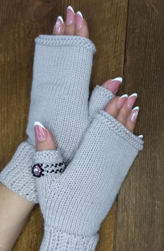Элегантные светлые митенки связаны из итальянского шерсти baby camel и декорированы вывязанным и вышитым бисером колечком! Тепло, очаровательно и нарядно))