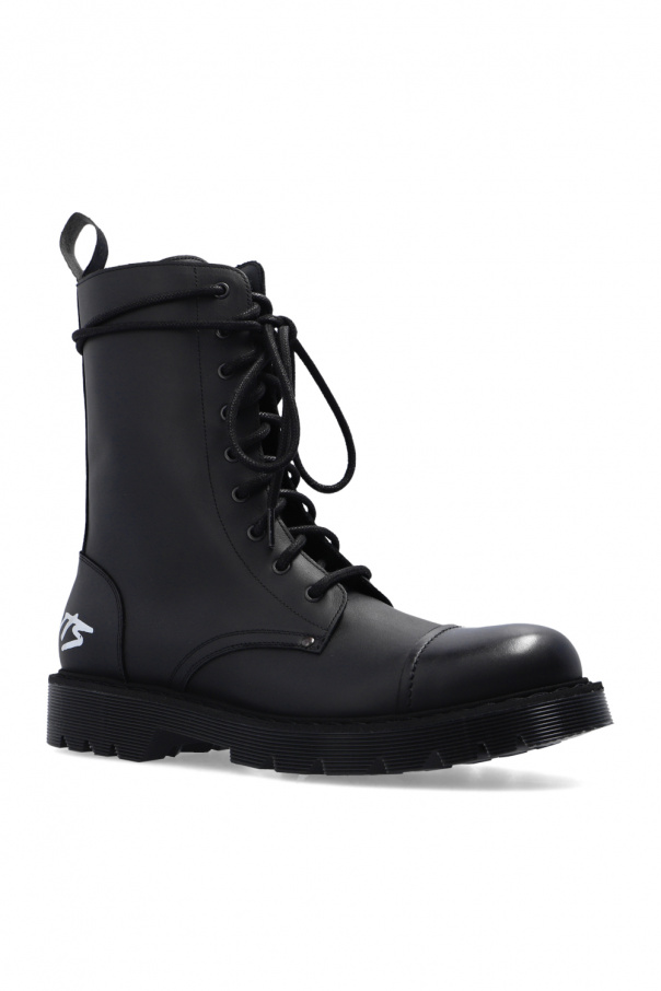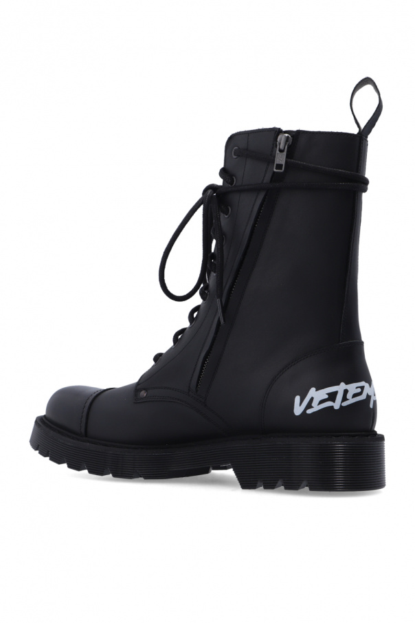 Black shoes from VETEMENTS. Made of leather, this lace-up model features a side zip fastening, stitched detailing on the front, a white logo print at the back and a black rubber sole at the base.
