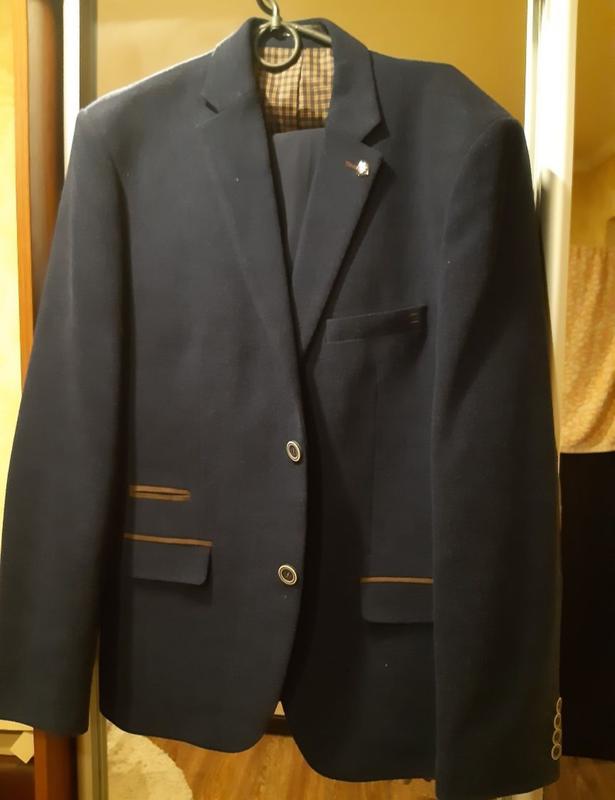 Костюм отличного качества. Одевался единажды на свадьбу. На фото весь комплект рубашка белая ,пиджак и брюки. Цвет темно синий. Очень солидно смотрится.